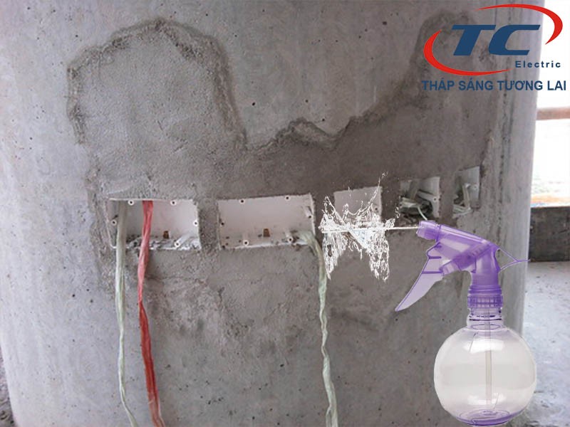 Bước 2: Dùng nước xịt vào khoảng trống chúng ta vừa mới khoan ( đục ) để làm tăng độ bám và kết dính của hồ ( vữa ).